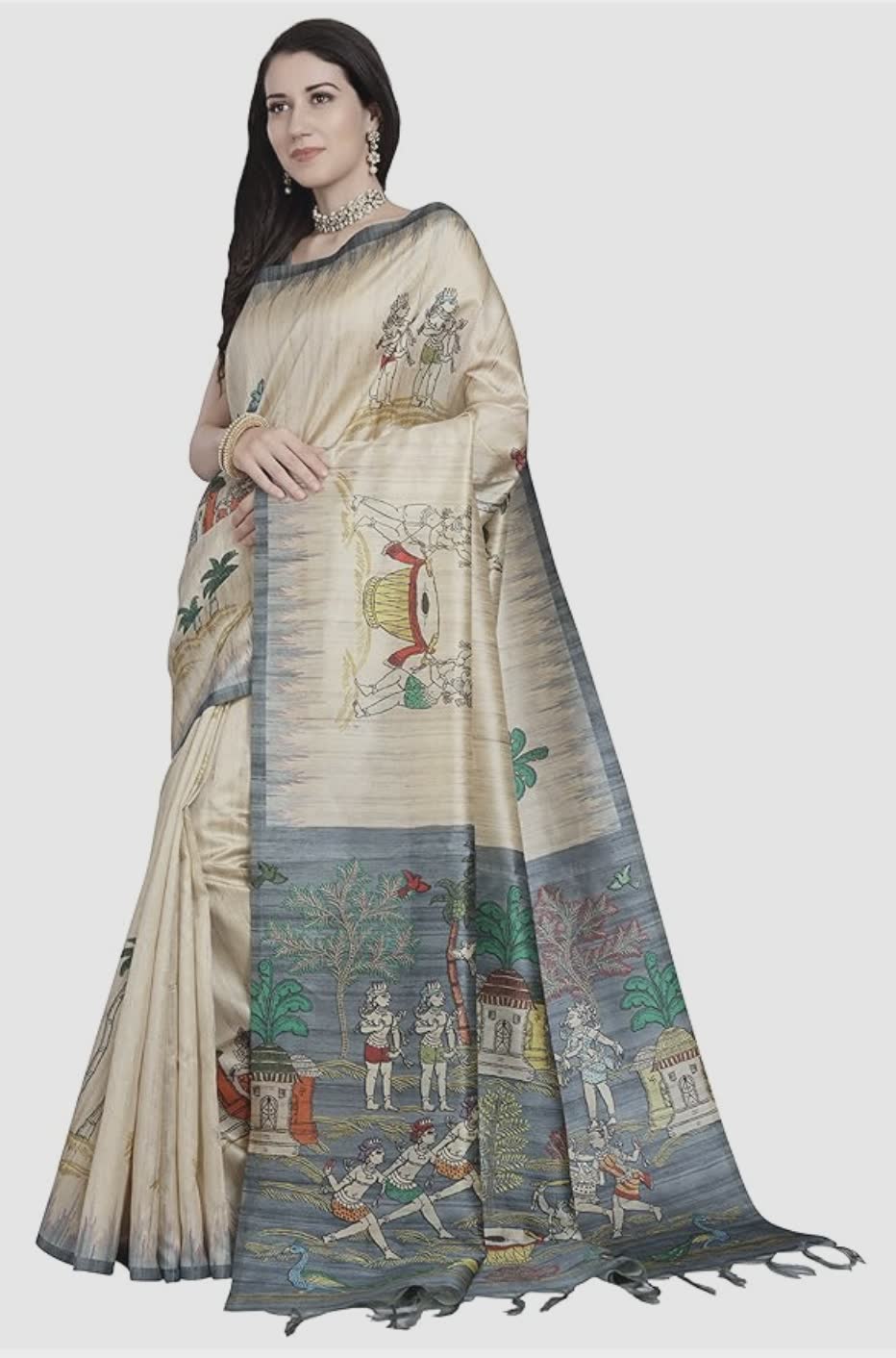 • Artificial Tussar Silk Bhagalpuri Saree with Tassels. This Saree is Patterned with Printed Tribal Art Paintings