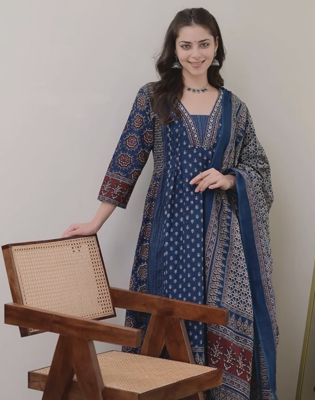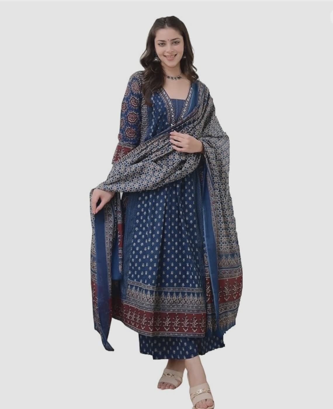 - Style :- Anarkali Kurta | Sleeve Length :- 3/4 Sleeve | Bottom :- Pant Includes a coordinated A-line kurta, ankle-length pants, and a stunning printed dupatta, offering a complete traditional look with minimal styling effort.