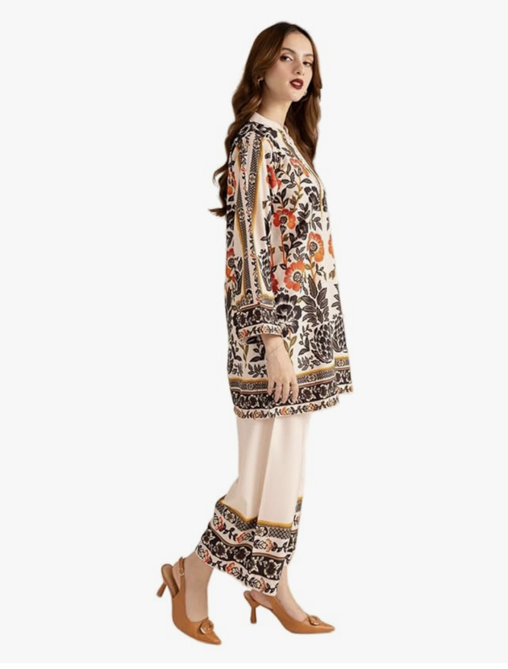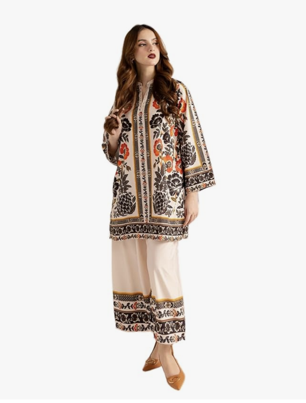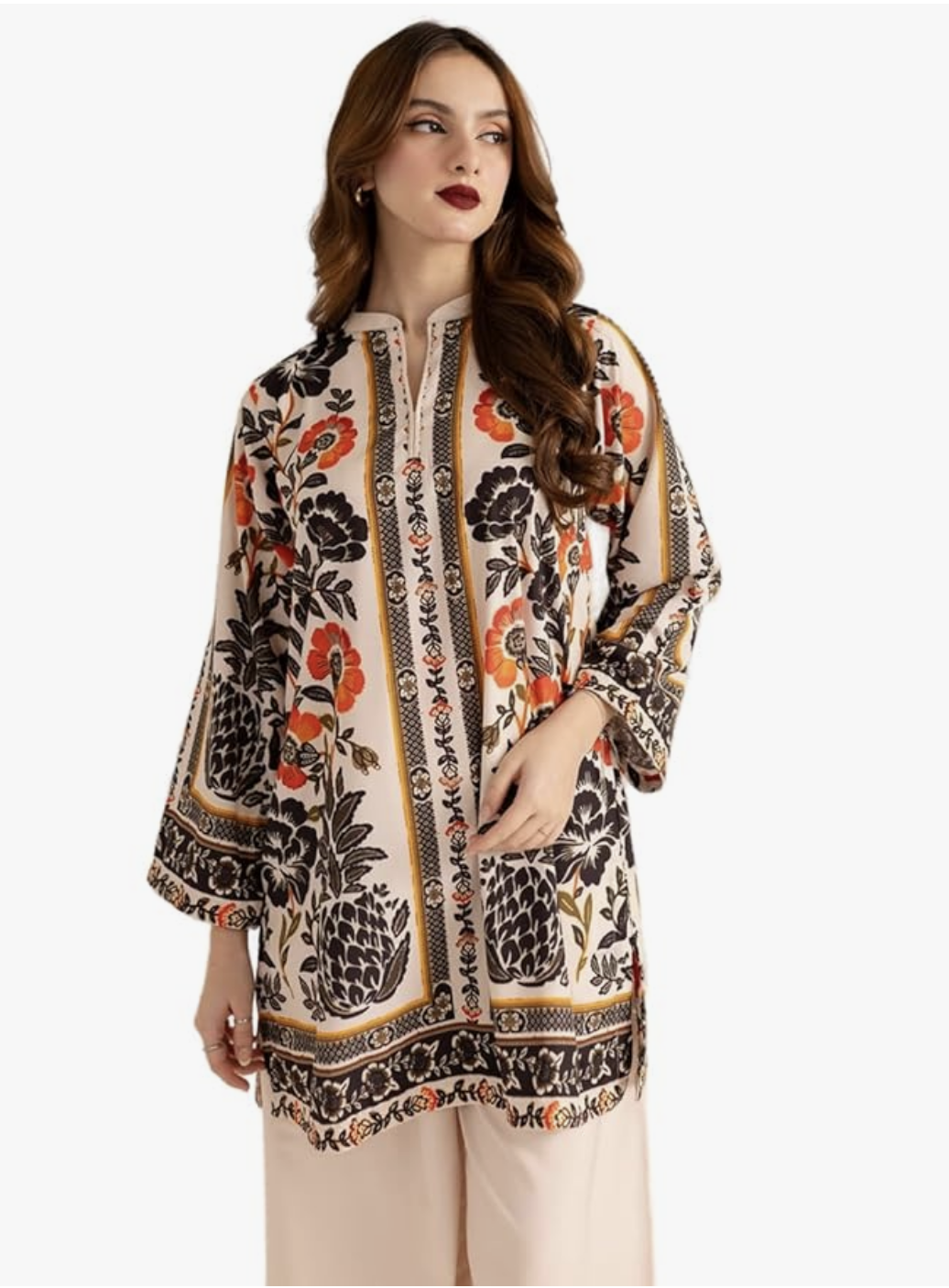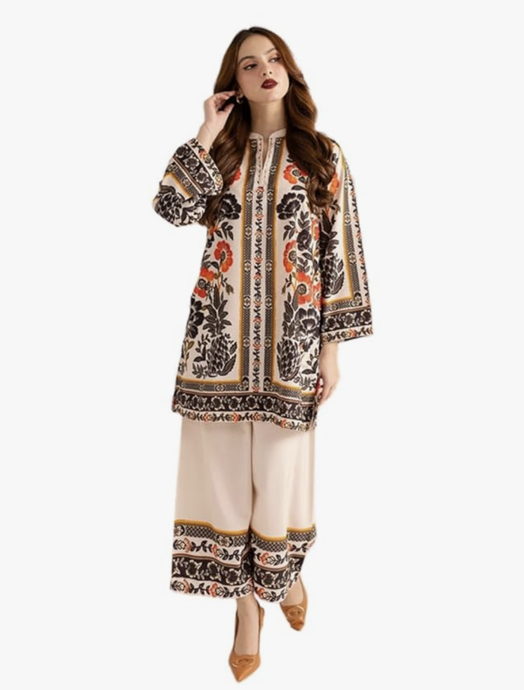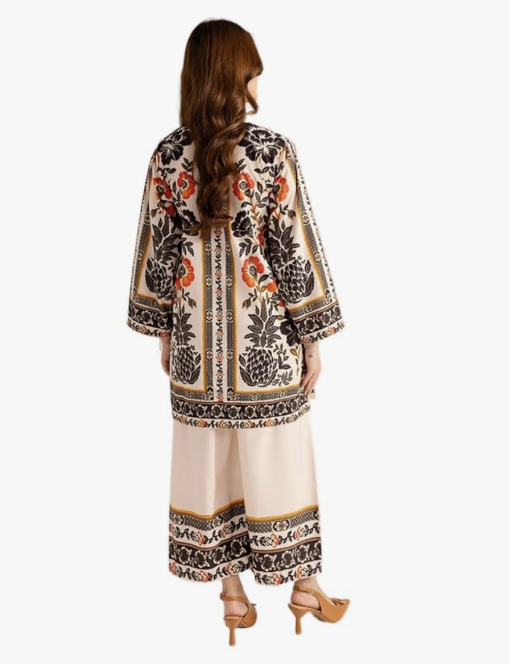 • PALAZZO DETAILS: Coordinated wide-leg palazzo pants in beige with matching printed border trim for a cohesive ensemble